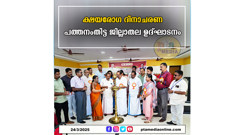 പത്തനംതിട്ട – ആരോഗ്യ വകുപ്പിന്റെ നേതൃത്വത്തിൽ ലോക ക്ഷയരോഗ ദിനാചരണ ഉദ്ഘാടനം ജില്ലാ പഞ്ചായത്ത് പ്രസിഡന്റ് ജോർജ് എബ്രഹാം റാന്നിയിൽ നിർവഹിച്ചു. റാന്നി ബ്ലോക്ക് പഞ്ചായത്ത് പ്രസിഡന്റ് കെ.എസ് ഗോപി അധ്യക്ഷനായി. ബോധവൽക്കരണ റാലി റാന്നി ഡി.വൈ.എസ്.പി. ആർ ജയരാജ് ഫ്‌ളാഗ് ഓഫ് ചെയ്തു. തിരുവല്ല സബ് കലക്ടർ സുമിത് കുമാർ ഠാക്കൂർ മുഖ്യാതിഥിയായി. ജില്ലാ മെഡിക്കൽ ഓഫീസർ (ആരോഗ്യം) ഡോ. എൽ അനിതകുമാരി മുഖ്യപ്രഭാഷണം നടത്തി. ജില്ലാ റ്റി. ബി. സെന്റർ റെസ്പിറേറ്ററി മെഡിസിൻ ജൂനിയർ കൺസൾട്ടന്റ് ഡോ. എസ്. നിയാസ് ഷാ വിഷയാവതരണം നടത്തി. താലൂക്ക് ആശുപത്രി സൂപ്രണ്ട് ഡോ.ലിന്റാ ജോസഫ് ദിനാചരണ പ്രതിജ്ഞ ചൊല്ലി. ആരോഗ്യ സ്ഥിരം സമിതി ചെയർമാൻ ജേക്കബ് സ്റ്റീഫൻ, അംഗം നയന സാബു, ജില്ലാ ടി.ബി ഓഫീസർ ഡോ. കെ. എസ് നിരൺ ബാബു, ജില്ലാ എജുക്കേഷൻ മീഡിയ ഓഫീസർ എസ് . ശ്രീകുമാർ, വെച്ചൂച്ചിറ സാമൂഹിക ആരോഗ്യ കേന്ദ്രം ബ്ലോക്ക് മെഡിക്കൽ ഓഫീസർ ഡോ. ലേഖ തോബിയാസ്, ഹെൽത്ത് സൂപ്പർവൈസർ എം കെ രാജു , റ്റി ബി അസോസിയേഷൻ അംഗം കെ.വി ജോൺസൻ എന്നിവർ പങ്കെടുത്തു.