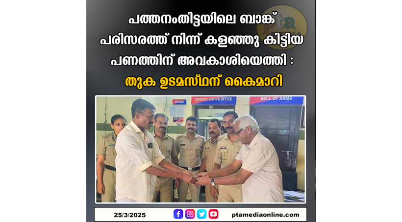 പത്തനംതിട്ടയിലെ ബാങ്ക് പരിസരത്ത് നിന്ന് കളഞ്ഞു കിട്ടിയ പണത്തിന് അവകാശിയെത്തി : തുക ഉടമസ്ഥന് കൈമാറി