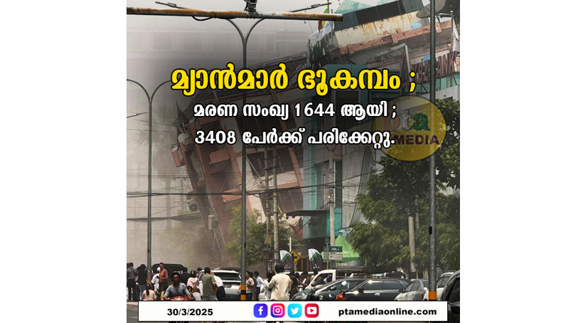 മ്യാൻമാർ ഭൂകമ്പം ; മരണ സംഖ്യ 1644 ആയി ; 3408 പേർക്ക് പരിക്കേറ്റു.