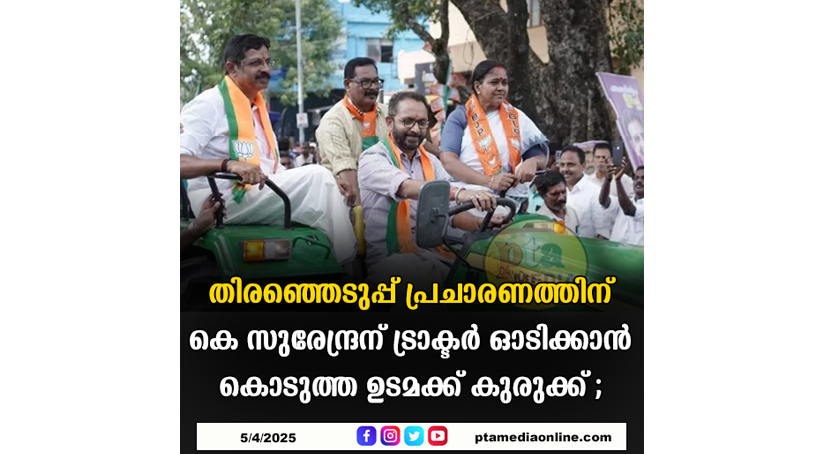 പാലക്കാട് – കഴിഞ്ഞ ഉപതിരഞ്ഞെടുപ്പ് പ്രചാരണത്തിനിടെ ബിജെപി മുൻ സംസ്ഥാന പ്രസിഡന്റ് കെ സുരേന്ദ്രൻ ട്രാക്ടർ ഓടിക്കാൻ കൊടുത്ത ഉടമയ്ക്ക് 5000 രൂപ പിഴ ചുമത്തി ട്രാഫിക് എൻഫോഴ്സ്മെന്റ്. സുരേന്ദ്രന് ട്രാക്ടർ ഓടിക്കാനുള്ള ലൈസൻസ് ഇല്ലെന്ന് കണ്ടെത്തിയതിന്റെ അടിസ്ഥാനത്തിലാണ് പിഴ ചുമത്തിയത്. ഇടത് സർക്കാരിന്റെ കർഷക വിരുദ്ധ നയങ്ങൾക്കെതിരെ ബിജെപി സ്ഥാനാർത്ഥി സി കൃഷ്ണകുമാറിനു വേണ്ടിയാണ് അന്നത്തെ സംസ്ഥാന അദ്ധ്യക്ഷൻ കെ സുരേന്ദ്രൻ ട്രാക്ടർ റാലി നടത്തിയത്. ട്രാക്ടർ റാലിയിൽ ട്രാക്ടർ ഓടിച്ച് തന്നെയാണ് സുരേന്ദ്രൻ എത്തിയത്. ഇതിനെതിരെ എറണാകുളം ശ്രീമൂല നഗരം സ്വദേശിയും എസ്എഫ്ഐ എറണാകുളം ജില്ലാ സെക്രട്ടറി ആയിരുന്ന ഫസൽ മുഹമ്മദ് കഴിഞ്ഞ നവംബറിൽ അന്നത്തെ പാലക്കാട് എസ്പി ആർ ആനന്ദിന് പരാതി നൽകിയിരുന്നു. തുടർന്ന് ട്രാഫിക് എൻഫോഴ്സ്മെന്റ് വിഭാഗം വാഹനം അന്വേഷിച്ച് കണ്ടെത്തുകയും ഉടമയിൽ നിന്ന് പിഴ ഈടാക്കുകയുമായിരുന്നു.