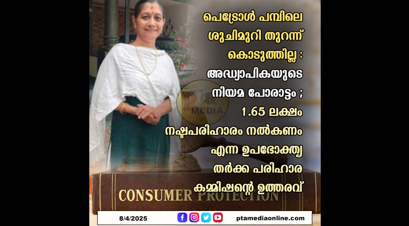 പത്തനംതിട്ട: പെട്രോൾ പമ്പിലെ ശുചിമുറി തുറന്നു കൊടുത്തില്ല. 1.65 ലക്ഷം നഷ്ടപരിഹാരം നൽകണമെന്ന് ഉപഭോക്തൃ തർക്ക പരിഹാര കമ്മിഷന്റെ ഉത്തരവ്. ഏഴംകുളം സ്വദേശിയായ അദ്ധ്യാപിക സി.എൽ.ജയകുമാരിയുടെ പരാതിയിൽ ആണ് കോഴിക്കോട് പയ്യോളിയിലെ പെട്രോൾ പമ്പ് ഉടമ ഫാത്തിമ ഹന്ന പിഴയടയ്ക്കേണ്ടത്.