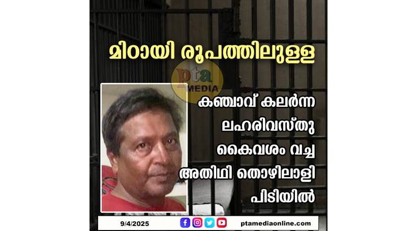ആറന്മുള: ലഹരി വസ്തുക്കൾ പല രൂപത്തിൽ എത്തുന്നു. കഞ്ചാവ് കലർന്ന മിഠായി രൂപത്തിലുള്ള ലഹരിവസ്തു കൈവശം വച്ച അതിഥി തൊഴിലാളി പിടിയിലായി. ഉത്തർപ്രദേശ് ഗോരക്പൂർ ബിസാര വില്ലേജിൽ റൂദാൽ എന്ന സ്ഥലത്ത് റാം ഹുസില (50) ആണ് ആറന്മുള പോലീസിന്റെ പിടിയിലായത്. ഇന്നലെ രാത്രി 10:45ന് ആറാട്ടുപുഴ ദേവീക്ഷേത്രം അംഗനവാടി റോഡിൽ പുതുവന പുത്തൻവീട്ടിൽ നിന്നാണ് എസ് ഐ വി വിഷ്ണുവിന്റെ നേതൃത്വത്തിൽ ലഹരിവസ്തു കണ്ടെടുത്തത്. പശ്ചിമ ബംഗാളിൽ നിന്നുള്ള അതിഥി തൊഴിലാളികൾ വാടകയ്ക്ക് താമസിക്കുന്ന വീട്ടിൽ കഞ്ചാവ് കലർന്ന മിഠായിരൂപത്തിലുള്ള ലഹരി വ്യവസ്ഥ സൂക്ഷിച്ചു വച്ചിരിക്കുന്നതായി പോലീസിന് രഹസ്യവിവരം ലഭിച്ചിരുന്നു.പോലീസ് ഇൻസ്പെക്ടർ വി എസ് പ്രവീണിന്റെ മേൽനോട്ടത്തിലായിരുന്നു പരിശോധന.
