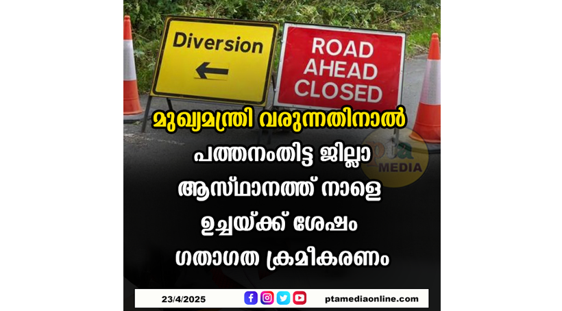 പത്തനംതിട്ട: മുഖ്യമന്ത്രിയുടെ സന്ദർശനവുമായി ബന്ധപ്പെട്ട് നാളെ ജില്ലാ ആസ്ഥാനത്ത് ഗതാഗത ക്രമീകരണങ്ങൾ ഏർപ്പെടുത്തിയതായി ജില്ലാ പോലീസ് മേധാവി അറിയിച്ചു. പുതിയ സ്വകാര്യ ബസ് സ്റ്റാൻഡിൽ നടക്കുന്ന പൊതുപരിപാടിയിൽ പങ്കെടുക്കാൻ വരുന്നവരുടെ വാഹനങ്ങൾ പാർക്ക് ചെയ്യാനുള്ള ഇടങ്ങൾ ക്രമീകരിച്ചിട്ടുമുണ്ട്. ഉച്ചയ്ക്ക് രണ്ടിന് ശഷം പുതിയ ബസ് സ്റ്റാൻഡിലേക്ക് ബസുകൾക്ക് പ്രവേശനമില്ല. രണ്ടു മണി മുതൽ ടൗണിൽ എത്തുന്ന എല്ലാ സ്വകാര്യ ബസുകളും പഴയ സ്റ്റാൻഡിൽ ആളെ ഇറക്കിയ ശേഷം യാത്ര തുടരണം. കെ.എസ്. ആർ.ടി.സി ബസുകൾക്ക് പതിവു രീതിയിൽ സർവീസ് നടത്താം. എന്നാൽ കുമ്പഴ യിലെത്തുന്ന ബസുകൾ മൈലപ്ര, ജില്ലാ പോലീസ് ഓഫീസ് ജങ്ഷൻ വഴി കെ.എസ്. ആർ.ടി.സി സ്റ്റാൻഡിലെത്തുകയും തിരികെ ഇതേ പാതയിൽ യാത്ര തുടരുകയും വേണം. അടൂർ,പന്തളം,കോഴഞ്ചേരി,ചെങ്ങന്നൂർ. തിരുവല്ല ഭാഗങ്ങളിൽ നിന്നുള്ള വാഹനങ്ങൾ സെന്റ് പീറ്റേഴ്സ് ജങ്ഷൻ, ജനറൽ ആശുപത്രി വഴി പഴയ ബസ് സ്റ്റാൻഡിലെത്തി ആളെ ഇറക്കിയ ശേഷം സെൻട്രൽ ജങ്ഷനിലൂടെ സെന്റ് പീറ്റേഴ്സ് ജങ്ഷനിലെത്തി യാത്ര തുടരണം.