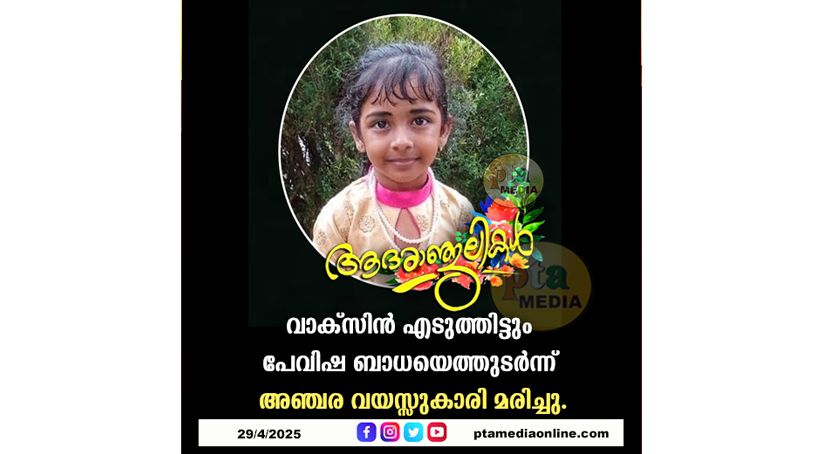 വാക്സിൻ എടുത്തിട്ടും തെരുവുനായയുടെ കടിയേറ്റ് പേവിഷ ബാധയെത്തുടർന്ന് അഞ്ചര വയസ്സുകാരി മരിച്ചു.