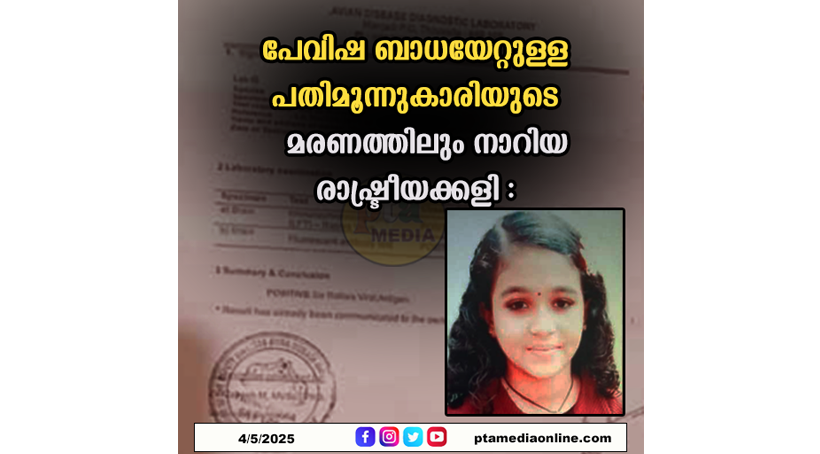 പത്തനംതിട്ട: പ്രതിരോധ വാക്സിന് എടുത്തിട്ടും പതിമൂന്നുകാരി പേപ്പട്ടി വിഷബാധയേറ്റ് മരിച്ച സംഭവത്തില് പരാതികള് ഒതുക്കി തീര്ക്കാനും പരിശോധന ഫലം അട്ടിമറിക്കാനും ശ്രമിച്ചുവെന്ന വിവരങ്ങള് പുറത്തു വന്നു. ആന്റി റാബീസ് വാക്സിന് എടുത്ത നാരങ്ങാനം നോര്ത്ത് കണമുക്ക് തറഭാഗം സ്വദേശിനി ശില്പ്പാ രാജന്റെയും ബിനോജിന്റെയും മകള് ഏഴാം ക്ലാസ് വിദ്യാര്ത്ഥിനി ഭാഗ്യലക്ഷ്മിയാണ് കഴിഞ്ഞ ഏപ്രില് ഒമ്പതിന് മരിച്ചത്. കുട്ടിയുടെ ആന്തരികാവയവങ്ങളുടെ പരിശോധന ഫലം ആദ്യം നെഗറ്റീവായിരുന്നു. എന്നാല്, സ്വകാര്യ ആശുപത്രി അധികൃതര് രണ്ടാമത് നടത്തിയ പരിശോധനയില് ഫലം പോസിറ്റീവ് ആണെന്ന് കണ്ടെത്തുകയായിരുന്നു.