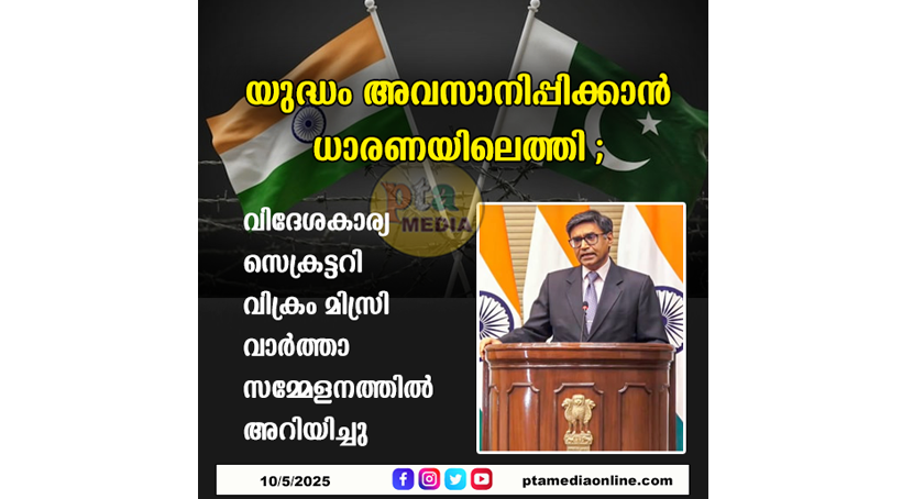ന്യൂഡൽഹി – ഇന്ന് മെയ് 10 ശനിയാഴ്ച വൈകുന്നേരം 5:00 മണി മുതൽ കര, വ്യോമ, കടൽ വഴിയുള്ള എല്ലാ യുദ്ധ നീക്കങ്ങളും, സൈനിക നടപടികളും നിർത്താൻ ഇന്ത്യയുടെയും പാകിസ്ഥാന്റെയും ഡയറക്ടർ ജനറൽ ഓഫ് മിലിട്ടറി ഓപ്പറേഷൻസ് (ഡിജിഎംഒ) സമ്മതിച്ചതായി വിദേശകാര്യ സെക്രട്ടറി വിക്രം മിശ്ര അറിയിച്ചു. യുഎസിന്റെ മധ്യസ്ഥതയിൽ ഇന്ത്യയും പാകിസ്ഥാനും “പൂർണ്ണവും അടിയന്തരവുമായ” വെടിനിർത്തലിന് സമ്മതിച്ചതായി യുഎസ് പ്രസിഡന്റ് ഡൊണാൾഡ് ട്രംപ് പറഞ്ഞതിന് തൊട്ടുപിന്നാലെയാണ് വിദേശകാര്യ സെക്രട്ടറിയുടെ ഹ്രസ്വ പ്രഖ്യാപനം വന്നത്. ഇന്ന് ഉച്ചകഴിഞ്ഞ് 3.35 ന് പാകിസ്ഥാൻ ഡിജിഎംഒ ഇന്ത്യൻ ഡിജിഎംഒയെ വിളിച്ചു, മിശ്ര പറഞ്ഞു. “ഇന്ത്യൻ സമയം ശനിയാഴ്ച വൈകുന്നേരം 5:00 മുതൽ പ്രാബല്യത്തിൽ വരുന്ന തരത്തിൽ കരയിലും ആകാശത്തും കടലിലും ഉള്ള എല്ലാ വെടിവയ്പ്പുകളും സൈനിക നടപടികളും നിർത്താൻ ഇരുപക്ഷവും തമ്മിൽ ധാരണയായി,” അദ്ദേഹം പറഞ്ഞു. “ഈ ധാരണ പ്രാബല്യത്തിൽ വരുത്താൻ ഇരുപക്ഷത്തിനും നിർദ്ദേശങ്ങൾ നൽകിയിട്ടുണ്ട്. മെയ് 12 ന് ഉച്ചയ്ക്ക് 12:00 മണിക്ക് ഡിജിഎംഒമാർ വീണ്ടും സംസാരിക്കും,” അദ്ദേഹം കൂട്ടിച്ചേർത്തു.