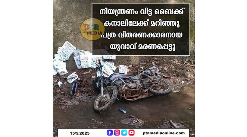നിയന്ത്രണം വിട്ട ബൈക്ക് കനാലിലേക്ക് മറിഞ്ഞു പത്ര വിതരണക്കാരനായ യുവാവ് മരണപ്പെട്ടു