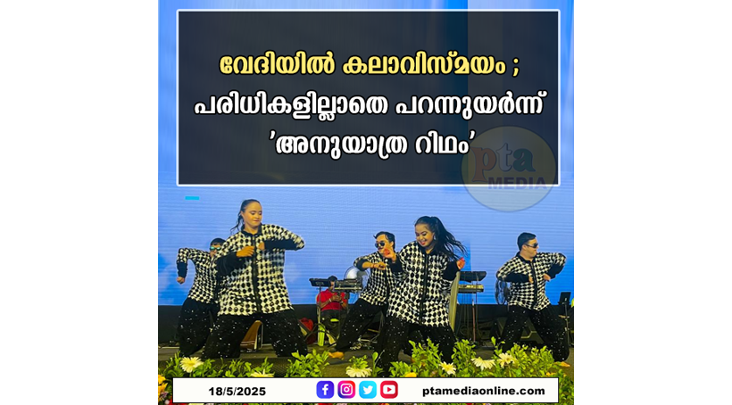 പത്തനംതിട്ട – പരിമിതി മറന്ന്, പരിധികളില്ലാതെ പറന്നുയർന്ന് ”അനുയാത്ര റിഥം” സംഘം. സർക്കാരിന്റെ നാലാം വാർഷികത്തോടനുബന്ധിച്ച് ശബരിമല ഇടത്താവളത്തിൽ നടക്കുന്ന ‘എന്റെ കേരളം’ പ്രദർശന വിപണന മേളയിൽ സാമൂഹിക നീതി വകുപ്പ് സംഘടിപ്പിച്ചത് നിറവർണത്തിൽ വിരിഞ്ഞ ഭിന്നശേഷി കലോത്സവം. ആട്ടവും പാട്ടുമായി കലാപ്രതിഭകളുടെ സംസ്ഥാന ആർട്സ് ട്രൂപ്പ് അനുയാത്ര കലാകാരന്മാർ വേദിയിൽ റിഥമേകി. ഇല്ലുമിനാറ്റിയും രംഗണ്ണനും കട്ടപ്പനയിലെ ഋത്വിക് റോഷനും അരങ്ങിൽ എത്തിയപ്പോൾ കയ്യടിയുടെ പൊടിപൂരം. സർഗവാസനയുള്ളവർക്ക് കലാപ്രകടനത്തിന് ശാരീരിക പരിമിതി തടസമല്ലെന്ന് തെളിയിച്ച് ‘അനുയാത്ര റിഥ’ത്തിന്റെ കലോത്സവം മേളയേയും ആവേശത്തിലാക്കി.