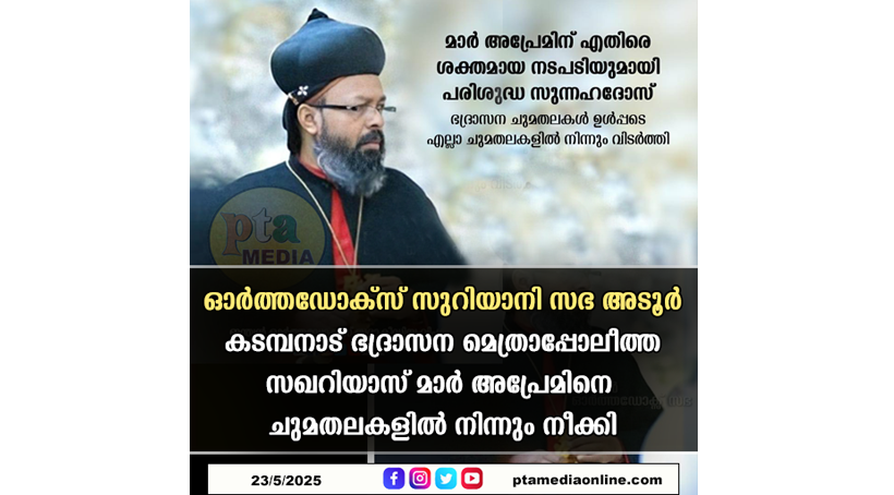 അടൂര് – മലങ്കര ഓര്ത്തഡോക്സ് സുറിയാനി സഭയുടെ അടൂര് കടമ്പനാട് ഭദ്രാസന മെത്രാപ്പോലീത്ത സഖറിയാസ് മാര് അപ്രേമിനെ ഭദ്രാസന ഭരണത്തില് നിന്നു നീക്കി.എപ്പിസ്കോപ്പല് സുന്നഹദോസിന്റെതാണ് തീരുമാനം. സഭയുമായി ബന്ധപ്പെട്ട എല്ലാ ഭരണപരമായ കാര്യങ്ങളില് നിന്നും സഭയുടെ വൈദിക സെമിനാരിയിലെ ചുമതലകളില് നിന്നും താല്ക്കാലികമായി മാറ്റി. ഏതാനും ആഴ്ച്ചകള്ക്ക് മുമ്പ് നടത്തിയ പ്രസംഗങ്ങളില് ഓര്ത്തഡോക്സ് സഭയുടെ ഔദ്യോഗിക നിലപാടുകള്ക്ക് എതിരായ പരാമര്ശങ്ങളാണ് നടപടിക്ക് കാരണമായത്.