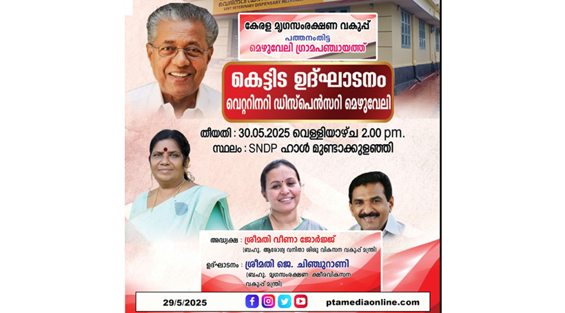 മെഴുവേലി – 1975 മുതൽ വാടക കെട്ടിടത്തിൽ പ്രവർത്തിച്ചുകൊണ്ടിരുന്ന വെറ്റിനറി ഡിസ്പെൻസറി സ്വന്തം കെട്ടിടത്തിൽ പ്രവർത്തനമാരംഭിക്കുകയാണ്. മെഴുവേലി ഗ്രാമപ്പഞ്ചായത്തിലെ പതിമൂന്നാം വാർഡിലെ മുണ്ടക്കുളഞ്ഞിയിൽ കേരള സർക്കാർ 66 ലക്ഷം രൂപ ചിലവിട്ടു നിർമ്മിച്ച കെട്ടിടത്തിൽ മെഴുവേലി വെറ്റിനറി ഡിസ്പെൻസറി പ്രവർത്തമാരംഭിക്കുകയാണ്. മൃഗസംരക്ഷണ മേഖലയിലെ പഞ്ചായത്തിന്റെ വികസന ചരിത്രത്തിലെ നാഴികക്കല്ലാകുന്ന ഈ ഡിസ്പെൻസറി കെട്ടിട ഉദ്ഘാടനം നാളെ ഉച്ചക്ക് 2 മണിക്ക് ആരോഗ്യ വകുപ്പ് മന്ത്രിയും സ്ഥലം എംഎൽഎയുമായ ശ്രീമതി വീണാ ജോർജ്ജ് അദ്ധ്യക്ഷയാകുന്ന ചടങ്ങിൽ, ബഹു. മൃഗ സംരക്ഷണ വകുപ്പ് മന്ത്രി ശ്രീമതി ജെ ചിഞ്ചുറാണി കെട്ടിട ഉദ്ഘാടനം നിർവഹിക്കുന്നു. മെഴുവേലി ഗ്രാമപ്പഞ്ചായത്ത് പ്രസിഡന്റായ ശ്രീമതി പിങ്കി ശ്രീധർ സ്വാഗത പ്രസംഗം നടത്തുന്ന ചടങ്ങിൽ ബഹു. എംപി ശ്രീ ആന്റോ ആന്റണി മുഖ്യ പ്രഭാഷണം നടത്തും. മെഴുവേലിയിലെ അടക്കം സാമൂഹിക, രാഷ്ട്രീയ രംഗങ്ങളിലെ പ്രമുഖർ അടക്കം പങ്കെടുക്കുന്ന ചടങ്ങിലേക്ക് എല്ലാ പൊതുജനങ്ങളുടെയും പങ്കാളിത്തം പഞ്ചായത്ത് പ്രസിഡന്റായ ശ്രീമതി പിങ്കി ശ്രീധർ അഭ്യർത്ഥിച്ചു.