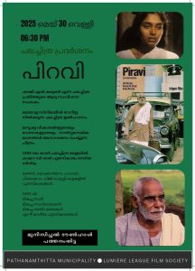 പത്തനംതിട്ട – നഗരസഭയുടെയും ലൂമിയർ ലീഗ് ഫിലിം സൊസൈറ്റിയുടെയും സംയുക്താഭിമുഖ്യത്തിൽ ഷാജി എൻ കരുൺ അനുസ്മരണവും ചലച്ചിത്ര പ്രദർശനവും 30 വൈകിട്ട് 5.30 ന് ടൗൺ ഹാളിൽ നടക്കും. നഗരസഭ ചെയർമാൻ അഡ്വ. ടി. സക്കീർ ഹുസൈൻ ഉദ്ഘാടനം ചെയ്യും. ലൂമിയർ ലീഗ് പ്രസിഡൻ്റ് ജി.വിശാഖൻ അദ്ധ്യക്ഷത വഹിക്കും. ‘രതിയില്ലാത്ത പ്രണയ രാഷ്ട്രീയം’ എന്ന വിഷയത്തിൽ ഡോ. മോൻസി ജോൺ, ‘ആർദ്രതയുടെ കല’ എന്നവിഷയത്തിൽ ഡോ. വിനോദ് രാജ്, ‘പിറവി മുതൽ ഓള് വരെ’ എന്ന വിഷയത്തിൽ എം എസ് . സുരേഷ് എന്നിവർ ഷാജി എൻ കരുണിൻ്റെ ചലച്ചിത ജീവിതത്തെ അനുസ്മരിച്ച് സംസാരിക്കും. തുടർന്ന് കാൻ മേളയിൽ പുരസ്കാരം നേടിയ ‘പിറവി’ പ്രദർശിപ്പിക്കും. പ്രവേശനം സൗജന്യമാണ്. കൂടുതൽ വിവരങ്ങൾക്ക് – ഫോൺ 9447945710