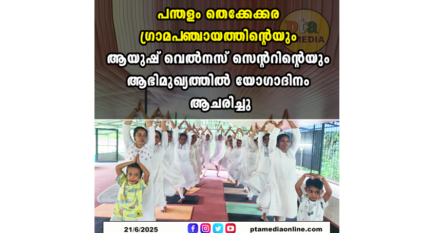 പന്തളം – തെക്കേക്കര ഗ്രാമപഞ്ചായത്തിന്റെയും ആയുഷ് വെൽനസ് സെന്ററിന്റെയും ആഭിമുഖ്യത്തിൽ അന്തരാഷ്ട്ര യോഗ ദിനം ആചരിച്ചു. ഒരിപ്പുറം ആയുർവേദ ഡിസ്പൻസറിയിൽ പ്രസിഡന്റ് എസ് രാജേന്ദ്രപ്രസാദ് ഉദ്ഘാടനം ചെയ്തു. വികസനകാര്യ സ്ഥിരം സമിതി അധ്യക്ഷൻ വി പി വിദ്യാധരപ്പണിക്കർ അധ്യക്ഷനായി. മെഡിക്കൽ ഓഫീസർ ഡോ. മാൻസി അലക്സ്, യോഗ ഇൻസ്ട്രക്ടർ കെ. ആർ രാജി എന്നിവർ പങ്കെടുത്തു.
