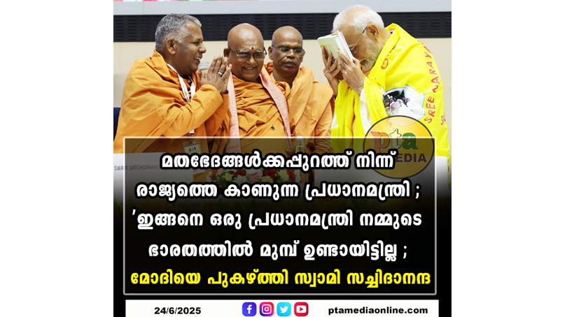 മതഭേദങ്ങൾക്കപ്പുറത്ത് നിന്ന് രാജ്യത്തെ കാണുന്നയാളാണെന്നും സ്വാമി സച്ചിദാനന്ദ പറഞ്ഞു. ഭാരതത്തിൽ ഇങ്ങനെ ഒരു പ്രധാനമന്ത്രി ഇതുവരെ ഉണ്ടായിട്ടില്ലെന്നും അദ്ദേഹം പറഞ്ഞു. ശ്രീനാരായണ ഗുരു – മഹാത്മഗാന്ധി സമാഗമ ശതാബ്ദി ആഘോഷ ചടങ്ങിൽ അധ്യക്ഷ പ്രസംഗം നടത്തുകയായിരുന്നു അദ്ദേഹം. പ്രധാനനമന്ത്രി നരേന്ദ്രമോദി പരിപാടി ഉദ്ഘാടനം ചെയ്തു.