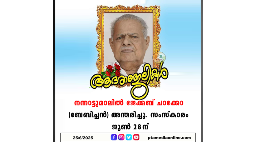 ആലപ്പുഴ – ലയൺസ് ക്ലബ് എടത്വയുടെ പ്രസിഡന്റും, കേരളാ ഗവ. കോൺട്രാക്ടേഴ്സ് അസോസിയേഷൻ മുൻ സംസ്ഥാന സെക്രട്ടറിയും മുൻ എ-ക്ലാസ് ഗവ. കോൺട്രാക്ടറുമായിരുന്ന എടത്വാ, പച്ച – ചെക്കിടിക്കാട് നന്നാട്ടുമാലിൽ ജേക്കബ് ചാക്കോ (ബേബിച്ചൻ) അന്തരിച്ചു. പ്രാർത്ഥനകളോടെ കുടുംബാംഗങ്ങളുടെ ദുഃഖത്തിൽ പങ്കുചേരുന്നു.