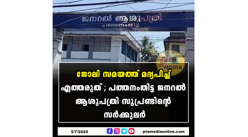ജോലി സമയത്ത് മദ്യപിച്ച് എത്തരുത് ; പത്തനംതിട്ട ജനറൽ ആശുപത്രി സൂപ്രണ്ടിന്റെ സർക്കുലർ