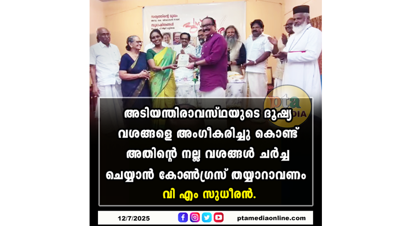 കോഴഞ്ചേരി – മുൻ എം എൽ എ അഡ്വ. കെ ശിവദാസൻ നായർ രചിച്ച സത്യത്തിൻ്റെ മുഖം എന്ന പുസതകത്തിൻ്റെ പ്രകാശന കർമ്മം നിർവ്വഹിച്ച് സംസാരിക്കുകയായിരുന്നു അദ്ദേഹം. ജവഹർലാൽ നെഹ്റുവിനെ തമസ്ക്കരിക്കാനുള്ള ആസുത്രിത ശ്രമങ്ങൾ ഇന്ന് വ്യാപകമാണ്. എന്നാൽ നെഹ്റുവിൻ്റെ നയങ്ങളാണ് ഇന്ത്യയെ ഇന്നും ഈ നിലയിൽ നിലനിർത്തുന്നത്. സ്വാതന്ത്രാനന്തരം നടന്ന തിരഞ്ഞെടുപ്പിൽ ആകെ 16 സീറ്റുകൾ മാത്രമുണ്ടായിരുന്ന ഇടതുപക്ഷത്തുന്നിന്നും എ കെ ജി ക്ക് പ്രതിപക്ഷ നേതാവിൻ്റെ പദവി നൽകിയത് തന്നെ ജനാധിപത്യത്തോടുള്ള അദ്ദേഹത്തിൻ്റെ പ്രതിബദ്ധത വ്യക്തമാക്കുന്ന സംഭവമാണ്. അടിയന്തിരാവസ്ഥ പ്രഖ്യാപിച്ച ഇന്ദിര തന്നെയാണ് രാജ്യത്തെ തിരഞ്ഞെടുപ്പുകളിലേക്ക് നയിച്ചതെന്നും വി എം സുധീരൻ പ്രസംഗത്തിൽ പറഞ്ഞു.