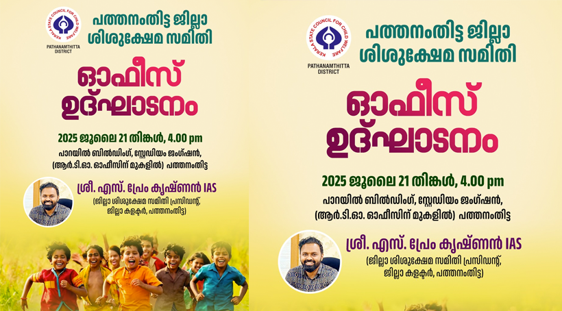 പത്തനംതിട്ട ജില്ലാ ശിശുക്ഷേമ സമിതി ഓഫീസ് ഉദ്ഘാടനം ജൂലൈ 21ന് .