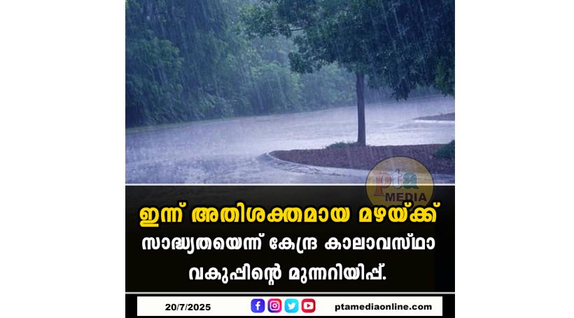 തിരുവനന്തപുരം – മദ്ധ്യ കേരളത്തിലും വടക്കൻ കേരളത്തിലും മലയോര മേഖലകളിലും അതിശക്തമായ മഴക്ക് സാദ്ധ്യത.. എറണാകുളം, ഇടുക്കി, തൃശ്ശൂർ, പാലക്കാട്, മലപ്പുറം, കോഴിക്കോട്, വയനാട്, കണ്ണൂർ, കാസർഗോഡ് ജില്ലകളിൽ ഓറഞ്ച് അലർട്ട് പ്രഖ്യാപിച്ചു. മഴക്കൊപ്പം ശക്തമായ കാറ്റിനും സാദ്ധ്യതയുള്ളതിനാൽ പൊതുജനങ്ങൾ ജാഗ്രത പാലിക്കണം എന്ന മുന്നറിയിപ്പുണ്ട്. തിരുവനന്തപുരം, കൊല്ലം ഒഴികെയുള്ള 12 ജില്ലകളിൽ ഇന്ന് മഴ മുന്നറിയിപ്പ് നൽകി. പത്തനംതിട്ട, ആലപ്പുഴ, കോട്ടയം ജില്ലകളിൽ യെല്ലോ മുന്നറിയിപ്പ്. തിരുവനന്തപുരം, കൊല്ലം, ആലപ്പുഴ, കണ്ണൂർ -കാസറഗോഡ് ജില്ലകളിലെ തീരങ്ങളിലും കന്യാകുമാരി തീരത്തും ഉയർന്ന തിരമാലയ്ക്കും കടലാക്രമണത്തിനും സാദ്ധ്യതയുണ്ടെന്ന് ദേശീയ സമുദ്രസ്ഥിതി പഠന ഗവേഷണ കേന്ദ്രം അറിയിച്ചു. കേരള- കർണാടക- ലക്ഷദ്വീപ് തീരങ്ങളിൽ മീൻപിടുത്തത്തിന് കടലിൽ പോകുന്നതിനുള്ള വിലക്ക് തുടരും.
