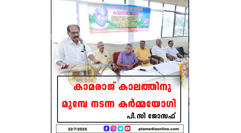 ഇടുക്കി: കാലത്തിനു മുമ്പേ നടന്ന കർമയോഗിയായിരുന്നു കെ. കാമരാജെന്ന് മുൻ എം.എൽ.എ പി.സി ജോസഫ് അഭിപ്രായപ്പെട്ടു. കാമരാജ് ഫൗണ്ടേഷൻ ഓഫ് ഇന്ത്യ സംഘടിപ്പിച്ച കാമരാജ് ജയന്തി വാരാഘോഷങ്ങളുടെ സമാപന സമ്മേളനം ഉദ്ഘാടനം ചെയ്ത് സംസാരിക്കുകയായിരുന്നു അദ്ദേഹം.