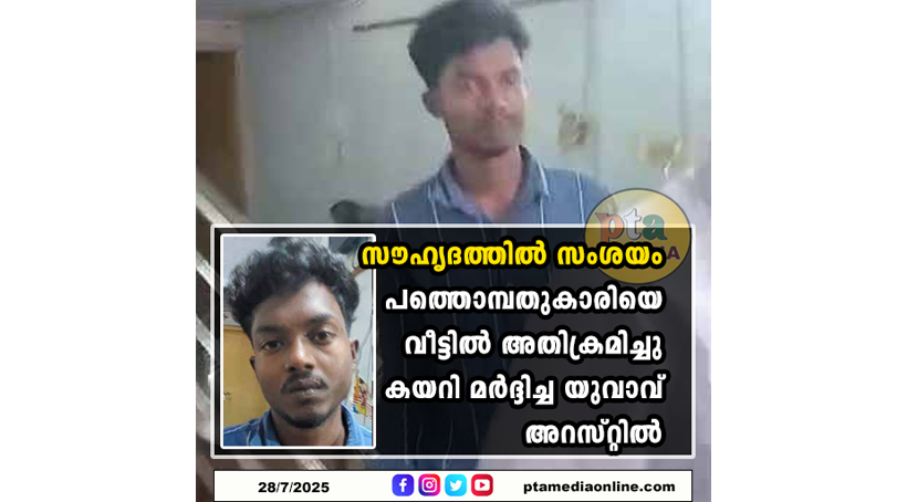 ഇന്നലെ രാത്രി പിതാവ് ഏനാത്ത് പോലിസ് സ്റ്റേഷനിൽ പരാതി നൽകിയതിനെതുടർന്ന്, യുവതിയുടെ മൊഴിയുടെ അടിസ്ഥാനത്തിൽ കേസ് രജിസ്റ്റർ ചെയ്തു. എസ് സി പി ഓ സിന്ധു എം കേശവൻ മൊഴി രേഖപ്പെടുത്തി, എസ്.ഐ ആർ.ശ്രീകുമാറാണ് കേസെടുത്തത്. ഇരുവരും മൂന്നുവർഷമായി സൗഹൃദത്തിലാണ്. നിരന്തരം ഫോൺ വിളിക്കുകയും സന്ദേശങ്ങൾ അയക്കുകയും ചെയ്യാറുമുണ്ട്. വീട്ടിൽ ആരും ഇല്ലാതിരുന്ന നേരത്താണ് ഇയാൾ അതിക്രമിച്ചു കയറി ദേഹോപദ്രവം ഏൽപ്പിച്ചത്. പ്രതിയെ ഉടനടി കസ്റ്റഡിയിലെടുത്തു. ചോദ്യം ചെയ്തപ്പോൾ കുറ്റം സമ്മതിച്ചു, ചാർജർ കേബിൾ കണ്ടെടുത്തു. തുടർനടപടികൾക്ക് ശേഷം പ്രതിയെ കോടതിയിൽ ഹാജരാക്കി.