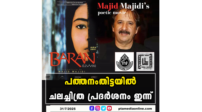 പത്തനംതിട്ട – നഗരസഭയുടെയും, ലുമിയർ ലീഗ് ഫിലിം സൊസൈറ്റിയുടെയും സംയുക്താഭിമുഖ്യത്തിൽ നടക്കുന്ന പ്രതിമാസ ചലച്ചിത്ര പ്രദർശനം ഇന്ന് വൈകിട്ട് ആറുമണിക്ക് ടൗൺഹാളിൽ നടക്കും. 50 – താമത് ചലച്ചിത്രമായി പ്രദർശിപ്പിക്കുന്നത് വിഖ്യാത ഇറാനിയൻ ചലച്ചിത്രകാരൻ മജീദ് മജീദി സംവിധാനം ചെയ്ത ‘ ബരാൻ ‘ എന്ന പേർഷ്യൻ സിനിമയാണ്. 2001 ൽ പുറത്തിറങ്ങിയ ബരാൻ അക്കൊല്ലത്തെ കേരളം അന്താരാഷ്‌ട്ര ചലചിത്രോത്സവത്തിൽ ഉദ്ഘാടന ചിത്രമായിരുന്നു.