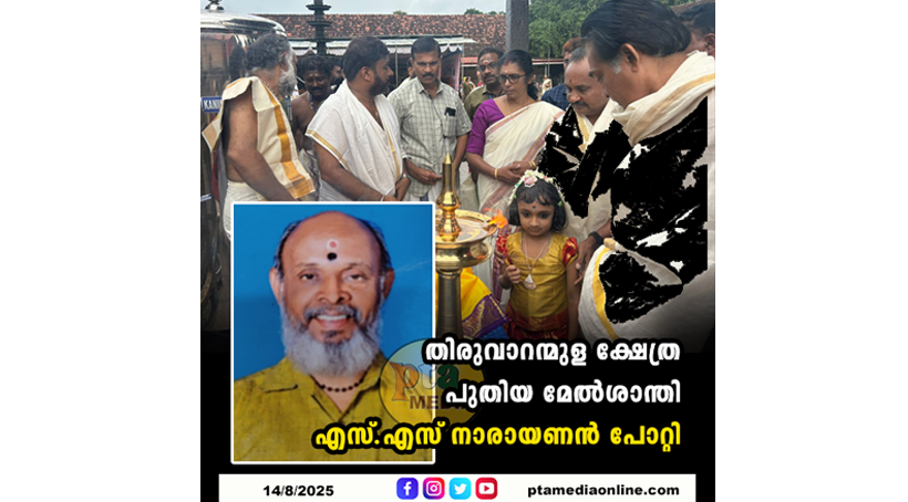 ആറന്മുള – തിരുവാറന്മുള ക്ഷേത്രത്തിലെ പുതിയ മേൽശാന്തിയായി എസ്.എസ് നാരായണൻ പോറ്റിയെ നറുക്കെടുപ്പിലൂടെ തിരഞ്ഞെടുത്തു. തിരുവനന്തപുരം ഉള്ളൂർ സ്വദേശിയായ എസ്.എസ് നാരായണൻ പോറ്റി മുമ്പ് പമ്പ ഗണപതി ക്ഷേത്രം, ചെട്ടികുളങ്ങര ക്ഷേത്രം എന്നിവിടങ്ങളിൽ മേൽശാന്തിയായി സേവനം അനുഷ്ഠിച്ചിട്ടുണ്ട്. സഹധർമ്മിണി – പാർവ്വതീ ദേവി, മക്കൾ – വൈശാഖ് ( ടെക്നോപാർക്ക് ), വൈഷ്ണവ് ( ക്രൈസ്റ്റ് യൂണിവേഴ്സിറ്റിയിൽ പഠിക്കുന്നു).