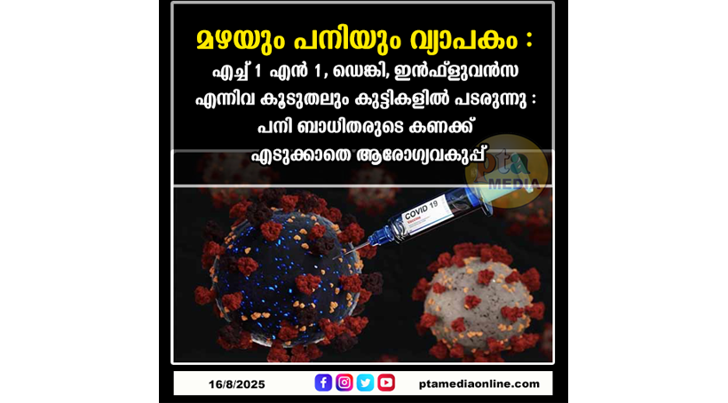 ഡെങ്കി, എച്ച് വണ് എന് വണ്, ഫ്ളു, ഇന്ഫ്ളുവന്സ അടക്കം വിവിധ തരം വൈറല് പനികളാണ് പടര്ന്നു പിടിക്കുന്നത്. സ്കൂള് കുട്ടികളിലാണ് ഏറെയും പനി കണ്ടു വരുന്നത്. ഇത് അതിവേഗം പടരുകയാണ്. പനിയുടെ ലക്ഷണങ്ങളോടെ വരുന്ന കുട്ടികള് സ്കൂളുകളില് തളര്ന്നു വീഴുന്ന അവസ്ഥയുമുണ്ട്. വിവിധ തരം പനികള്ക്ക് വ്യത്യസ്തമായ രോഗലക്ഷണങ്ങളാണ് ഉള്ളത്. ദിവസങ്ങളോളം ശരീരത്തിലെ താപനില ഉയര്ന്നു നില്ക്കുക, ഛര്ദിയും വയറിളക്കവും, ചൂടുകൂടി അപസ്മാരം പോലെ വരിക എന്നിവയാണ് കുട്ടികളില് കണ്ടു വരുന്ന പനിയുടെ മുഖ്യലക്ഷണങ്ങള്. ശ്വാസകോശത്തിലെ അണുബാധയും കഫക്കെട്ടും പലപ്പോഴും ന്യൂമോണിയയിലേക്കും വഴി മാറുന്നു. കുട്ടികളെ ദിവസങ്ങളോളം ആശുപത്രിയില് അഡ്മിറ്റ് ചെയ്ത് ആന്റിബയോട്ടിക് അടക്കം നല്കിയെങ്കില് മാത്രമേ പനി കുറയുന്നുള്ളൂവെന്നതാണ് സ്ഥിതി.