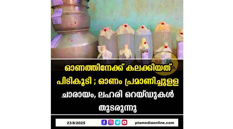 മല്ലപ്പള്ളി – ഓണം ലക്ഷ്യമിട്ട് കലക്കി തയ്യാറാക്കിയ ചാരായവും, കോടയും എക്സൈസ് സംഘം പിടികൂടി. വീട്ടുടമയ്ക്ക് എതിരേ കേസെടുത്തു. റാന്നി റേഞ്ച് ഇൻസ്പെക്ടർ അജികുമാറും സംഘവും കോട്ടാങ്ങൽ കിടാരക്കുഴി മാവോലിക്കൽ വാരിക്കാട്ട് ശിവദാസൻ പിള്ളയുടെ വീട്ടിൽ നടത്തിയ പരിശോധനയിലാണ് 40 ലിറ്റർ ചാരായവും 500 ലിറ്റർ കോടയും വാറ്റ് ഉപകരണങ്ങളും പിടികൂടിയത്. ശിവദാസൻ പിള്ളയ്ക്ക് എതിരേ കേസെടുത്തു. അസിസ്റ്റന്റ് എക്സൈസ് ഇൻസ്പെക്ടർ അലക്സാണ്ടർ പി. ജേക്കബ്, പ്രിവന്റീവ് ഓഫിസർ ബിനു രാജ്, സിവിൽ എക്സൈസ് ഓഫീസർമാരായ രജീഷ്, രതീഷ്, പ്രകാശ്, അതിൽ, വഭാഗ്യലക്ഷ്മി, ഡ്രൈവർ സുരേഷ് കുമാർ എന്നിവർ പങ്കെടുത്തു.