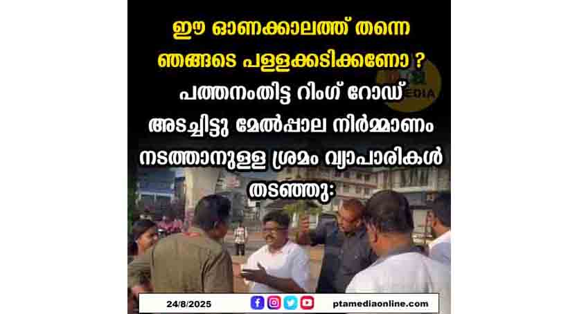 പത്തനംതിട്ട: ടൗൺ സ്ക്വയർ മേൽപ്പാല നിർമാണത്തിന്റെ ഭാഗമായി റോഡ് അടയ്ക്കാനുള്ള ശ്രമം വ്യാപാരികൾ തടഞ്ഞു. റിങ് റോഡിൽ ടൗൺ സ്ക്വയർ ജങ്ഷനിൽ നിന്ന് സ്വകാര്യ ബസ് സ്റ്റാൻഡിലേക്കും മുത്തൂറ്റ് ആശുപത്രിയിലേക്കുമുള്ള ഭാഗമാണ് ഇന്നലെ മുതൽ അടയ്ക്കുമെന്ന് അറിയിച്ചിരുന്നത്. ഇവിടെ മേൽപ്പാലത്തിന്റെ തൂണുകൾ നിർമിക്കുന്നതിന് വേണ്ടിയുള്ള പണി നടത്തുന്നതിന് വേണ്ടിയാണ് റോഡുകൾ അടയ്ക്കുമെന്ന് പൊതുമരാമത്ത് അസി. എൻജിനീയർ അറിയിച്ചിരുന്നത്. രാവിലെ തന്നെ പുതിയ സ്വകാര്യ ബസ് സ്റ്റാൻഡിൽ നിന്ന് ബസുകൾ ഇറങ്ങി വരുന്ന ഭാഗം പൊതുമരാമത്ത് അധികൃതർ അടച്ചിരുന്നു. ഇതിന പിന്നാലെയാണ് വ്യാപാരികൾ രംഗത്തിറങ്ങി ഉദ്യോഗസ്ഥരെ തടഞ്ഞത്. ഓണക്കാലത്ത് വ്യാപാര മേഖലയെ പ്രതിസന്ധിയിലാക്കുന്ന തീരുമാനമാണ് പൊതുമരാമത്തിന്റെ ഭാഗത്തു നിന്നുണ്ടാകുന്നതെന്ന് വ്യാപാരി വ്യവസായി കോൺഗ്രസ് ജില്ലാ പ്രസിഡന്റ് അബ്ദുൾ ഷുക്കൂർ പറഞ്ഞു. യാതൊരു മുന്നറിയിപ്പുമില്ലാതെയാണ് ഗതാഗതം തടഞ്ഞത്. ഓണക്കാലം ലക്ഷ്യമിട്ട് വ്യാപാരികൾ ലക്ഷങ്ങളുടെ സാധനങ്ങൾ സ്റ്റോക്ക് ചെയ്തിരിക്കുകയാണ്. ഈ സാഹചര്യത്തിൽ റോഡ് അടയ്ക്കുന്നത് കച്ചവടക്കാരെ ആത്മഹത്യയിലേക്ക് നയിക്കുമെന്ന് പറഞ്ഞാണ് വ്യാപാരികൾ ഉദ്യോഗസ്ഥരെ തടഞ്ഞത്. വ്യാപാരികളെ ആത്മഹത്യയിലേക്ക് നയിക്കുന്ന തീരുമാനമാണിതെന്ന് അബ്ദുൾ ഷുക്കൂർ പറഞ്ഞു.