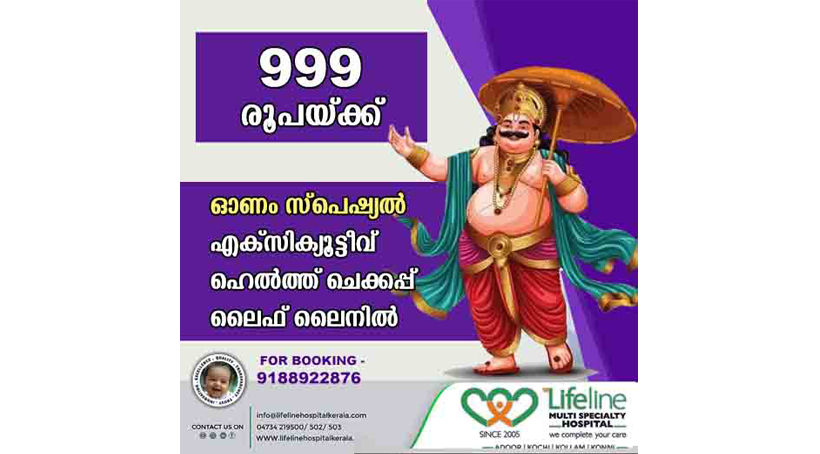 അടൂർ – ഓണം ആരോഗ്യത്തോടെ ആഘോഷിക്കുവാൻ ലക്ഷ്യമിട്ട് അടൂർ ലൈഫ് ലൈൻ ആശുപത്രി ഓണം സ്പെഷ്യൽ എക്സിക്യൂട്ടീവ് ഹെൽത്ത് ചെക്കപ്പ് കൺസെഷൻ നിരക്കായ 999 രൂപയ്ക്ക് നടത്തുന്നു. സെപ്റ്റംബർ ഒന്ന് മുതൽ 30 വരെ ഈ നിരക്കിൽ ചെക്കപ്പ് നടത്താം. ഇന്ന് മുതൽ 9188922876 എന്ന നമ്പറിൽ ബുക്ക് ചെയ്യാവുന്നതാണ്.