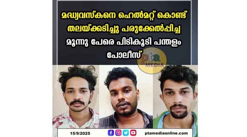 പന്തളം – മദ്ധ്യവസ്കനെ ഹെൽമെറ്റ് കൊണ്ട് തലയ്ക്കടിച്ച് പരുക്കേൽപ്പിച്ച കേസിൽ മൂന്നു പ്രതികളെ പോലീസ് പിടികൂടി. നിരവധി ക്രിമിനൽ കേസുകളിൽ പ്രതികളായ മങ്ങാരം മുത്തുണിയിൽ ദിൽഷാ മൻസിലിൽ ദിൽക്കു ദിലീപ് (25), ഏനാത്ത് മണ്ടച്ചൻപാറ പറവിള പുത്തൻവീട്ടിൽ ജെബിൻ തോമസ് (28), മങ്ങാരം കുരീക്കാവിൽ അജിൽ കൃഷ്ണൻ (28) എന്നിവരാണ് അറസ്റ്റിലായത്. കടയ്ക്കാട് വലിയിവിള കിഴക്കേതിൽ അബ്ദുൽ റഹ്മാനാണ് മർദ്ദനമേറ്റത്.