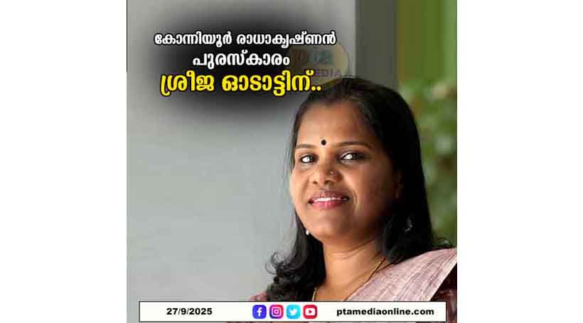 പത്തനംതിട്ട : അദ്ധ്യാപക ശ്രേഷ്ഠനും പ്രമുഖ സാഹിത്യക്കാരനുമായ കോന്നിയൂർ രാധാകൃഷ്ണൻ്റെ പേരിൽ കോന്നിയൂർ രാധാകൃഷ്ണൻ സൗഹൃദവേദി ഏർപ്പെടുത്തിയ രണ്ടാമത് പുരസ്കാരം കുറ്റൂർ സർക്കാർ സ്കൂളിലെ മലയാളം അദ്ധ്യാപിക ശ്രീജ ഓടാട്ടിന് ഒക്ടോബർ 11 ശനിയാഴ്ച രാവിലെ 11 ന് പത്തനംതിട്ട ശാന്തി റസിഡൻസിൽ ചേരുന്ന ചടങ്ങിൽ വിതരണം ചെയ്യുമെന്ന് സെക്രട്ടറി സലിം പി. ചാക്കോ അറിയിച്ചു.