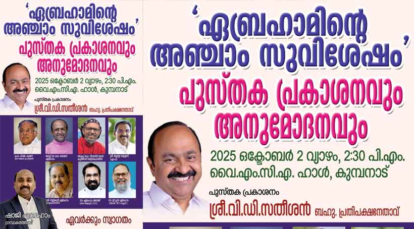 കുമ്പനാട്: ക്രൈസ്തവ സാഹിത്യത്തിലെ മികച്ച ഗ്രന്ഥകാരനും പ്രശസ്ത സുവിശേഷ പ്രസംഗകനുമായ ഷാജി ഏബ്രഹാം രചിച്ച ഏബ്രഹാമിന്റ അഞ്ചാം സുവിശേഷമെന്ന പുസ്തകത്തിന്റെ പ്രകാശന കർമ്മം മറ്റെന്നാൾ 2.30ന് കുമ്പനാട് വൈ.എം.സി.എ ഹാളിൽ വെച്ച് പ്രതിപക്ഷ നേതാവ് വി ഡി സതീശൻ നിർവ്വഹിക്കും. സമൂഹത്തിൽ വ്യത്യസ്ഥ മേഖലകളിൽ തങ്ങളുടേതായ വ്യക്തിമുദ്ര പതിപ്പിച്ച ജൈവ കർഷകനും കേരള കോൺഗ്രസ് സംസ്ഥാന കോർഡിനേറ്ററുമായ അപ്പു ജോൺ ജോസഫിനെയും പ്രവാസിയും കാരുണ്യ പ്രവർത്തകനുമായ വി സി മാത്യു എന്നിവരെ ആദരിക്കും. സമ്മേളനത്തിൽ രാജ്യസഭ മുൻ ഉപാദ്ധ്യക്ഷൻ പി ജെ കുര്യൻ അദ്ധ്യക്ഷത വഹിക്കും. അന്റോ ആന്റണി എംപി, യാക്കോബായ സഭ നിരണം ഭദ്രാസനധിപൻ ഡോ ഗീവർഗീസ് മാർ കൂറിലോസ് മെത്രാപ്പോലീത്താ, ഇവാഞ്ജലിക്കൽ സഭ പ്രിസൈഡിങ് ബിഷപ്പ് ഡോ തോമസ് ഏബ്രഹാം, മാധ്യമ പ്രവർത്തകൻ സണ്ണിക്കുട്ടി ഏബ്രഹാം, ചെങ്ങന്നൂർ മുൻസിപ്പൽ ചെയർപെയ്സൺ ശോഭ വർഗീസ്, കെപിസിസി സെക്രട്ടറി അനീഷ് വരിക്കണ്ണാമല തുടങ്ങിയവർ പങ്കെടുക്കുമെന്ന് പ്രോഗ്രാം കൺവീനർ സുബിൻ നീറുംപ്ലാക്കൽ അറിയിച്ചു.