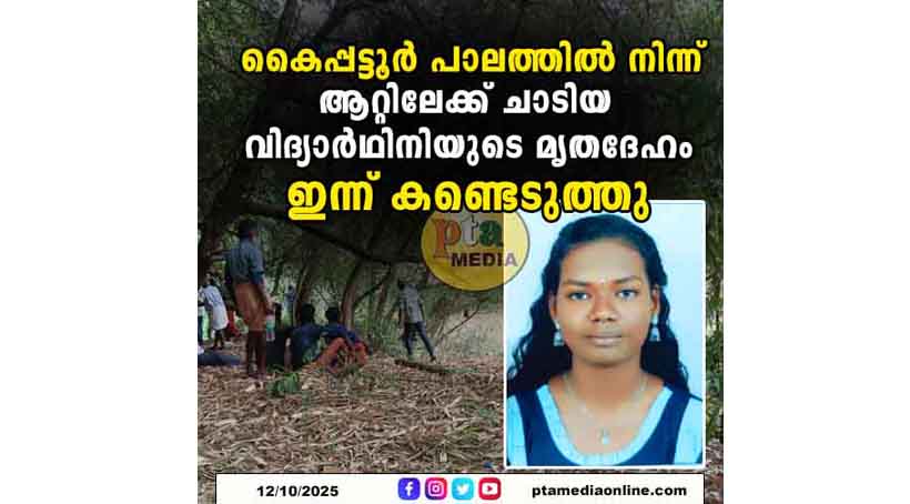കൈപ്പട്ടൂർ – പാലത്തിൽ നിന്ന് ആറ്റിലേക്ക് ചാടിയ വിദ്യാർത്ഥിനിയുടെ മൃതദേഹം നാലാം ദിവസമായ ഇന്ന് ഫയർഫോഴ്സ് സ്കൂബ ടീം കണ്ടെടുത്തു. ചന്ദനപ്പള്ളി നല്ലാനിക്കുന്നിൽ സന്തോഷ് അജയശ്രീ ദമ്പതികളുടെ ഏകമകൾ എസ്. സന്ധ്യ (17)യുടെ മൃതദേഹമാണ് ഇന്ന് രാവിലെ പത്തു മണിയോടെ ഓമല്ലൂർ ആറാട്ടുകടവിന് ഒരു കിലോമീറ്റർ താഴെ മുളങ്കൂട്ടത്തിൽ കുടുങ്ങിയ നിലയിൽ സ്കൂബ ടീം കണ്ടെടുത്തത്. മൂന്ന് ദിവസം മുമ്പ് എട്ടാം തീയതി വൈകിട്ട് ഏഴു മണിയോടെയാണ് പാലത്തിൽ നിന്ന് പെൺകുട്ടി ആറ്റിലേക്ക് ചാടിയത്. ചാടുന്നതിന് മുൻപായി വീട്ടിലേക്ക് വിളിച്ച് താൻ ചാടാൻ പോകുന്ന വിവരം പറഞ്ഞിരുന്നു. കുട്ടിയെ പാലത്തിനടുത്ത് കൊണ്ടുവിട്ട ഓട്ടോറിക്ഷക്കാരും വീട്ടിലേക്ക് വിളിച്ചറിയിച്ചിരുന്നു. ഇതറിഞ്ഞ് കൈപ്പട്ടൂരിൽ തന്നെയുണ്ടായിരുന്ന പിതാവ് ഓടിയെത്തി പാലത്തിന് താഴെ ചാടിയിറങ്ങി. ഇദ്ദേഹത്തിന് കാലിന് പരുക്കേറ്റു. പാലത്തിന് സമീപം താമസിക്കുന്ന ആളാണ് കുട്ടി ചാടിയെന്ന വിവരം സ്ഥിരീകരിച്ചത്.
