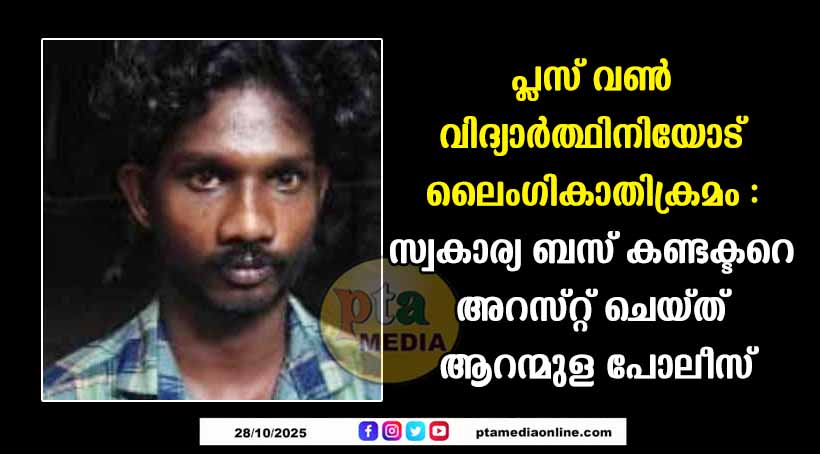 പത്തനംതിട്ട – ബസിലെ സ്ഥിരമായ യാത്രയ്ക്കിടെ പരിചയപ്പെട്ട് അടുപ്പത്തിലായ പ്ലസ് വൺ വിദ്യാർത്ഥിനിയോട് ലൈംഗികാതിക്രമം കാട്ടിയ ബസ് കണ്ടക്ടറെ ആറന്മുള പോലീസ് അറസ്റ്റ് ചെയ്തു. മാവേലിക്കര തഴക്കര പുത്തൻപറമ്പിൽ സുധി (26) യാണ് പിടിയിലായത്. പെൺകുട്ടി യാത്ര ചെയ്തിരുന്ന സ്വകാര്യ ബസിലെ കണ്ടക്ടർ ആയിരുന്നു സുധി. പെൺകുട്ടിയുമായി പരിചയത്തിലായി സ്നേഹബന്ധം സ്ഥാപിച്ച ശേഷം ലൈംഗികമായി ഉപദ്രവിക്കുകയായിരുന്നു. കുട്ടിയുടെ മൊഴി പ്രകാരം കേസ് രജിസ്റ്റർ ചെയ്തു അന്വേഷണം നടത്തിയ ആറന്മുള എസ്.ഐ വിഷ്ണുവാണ് പ്രതിയെ അറസ്റ്റ് ചെയ്തത്. കോടതിയിൽ ഹാജരാക്കിയ പ്രതിയെ റിമാൻഡ് ചെയ്തു.