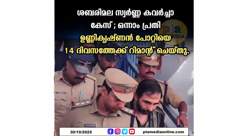 പത്തനംതിട്ട – കസ്റ്റഡി കാലാവധി അവസാനിച്ചതിനെ തുടർന്ന് പ്രത്യേക അന്വേഷണ സംഘം ഉണ്ണികൃഷ്ണൻ പോറ്റിയെ റാന്നി ഫസ്റ്റ് ക്ലാസ് മജിസ്ട്രേറ്റ് കോടതിയിൽ ഹാജരാക്കിപ്പോഴാണ് കോടതി റിമാൻ്റ് ചെയ്ത്കൊണ്ട് ഉത്തരവായത്. തുടർന്ന് ഇയാളെ തിരുവനന്തപുരം സ്പെഷ്യൽ ജെയിലിലേക്ക് കൊണ്ടുപോയി.