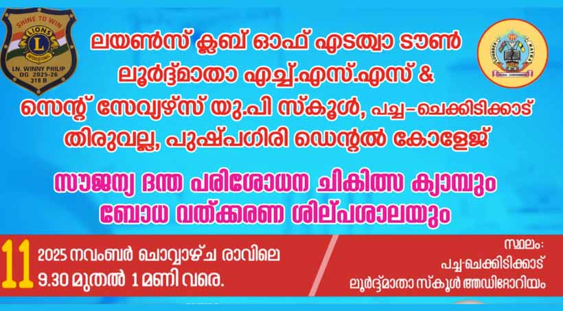 എടത്വ: ലയൺസ് ക്ലബ് ഡിസ്ട്രിക്ട് 318ബി പുഞ്ചിരി പ്രോജക്ടിന്റെ ഭാഗമായി ലയൺസ് ക്ളബ് ഓഫ് എടത്വ ടൗണിന്റെ നേത്യത്വത്തില് തിരുവല്ല പുഷ്പഗിരി ഡന്റ്ൽ കോളജിന്റെ സഹകരണത്തോടെ നവംബർ 11ന് രാവിലെ 9.30 മുതൽ 1മണി വരെ സൗജന്യ ദന്ത ചികിത്സ ക്യാമ്പ് സംഘടിപ്പിക്കുന്നു. എടത്വ പച്ച ലൂർദ് മാതാ ഹയർ സെക്കൻണ്ടറി സ്ക്കൂൾ ഓഡിറ്റോറിയത്തിൽ നടത്തുന്ന ക്യാമ്പ് ഫാദർ ജോസഫ് ചൂളപറമ്പിൽ ഉദ്ഘാടനം ചെയ്യും.ക്ളബ് പ്രസിഡന്റ് ഡോ. ജോൺസൺ വി.ഇടിക്കുള അധ്യക്ഷത വഹിക്കും.
