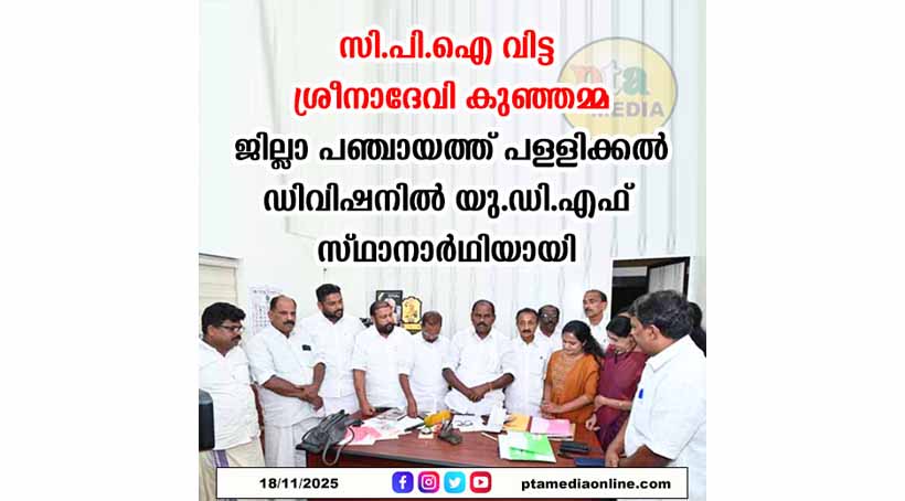 പത്തനംതിട്ട – സി.പി.ഐയില്‍ നിന്ന് രാജി വച്ച മുന്‍ ജില്ലാ പഞ്ചായത്തംഗം ശ്രീനാദേവി കുഞ്ഞമ്മ കോണ്‍ഗ്രസില്‍ ചേര്‍ന്നു. സിറ്റിങ് ഡിവിഷനായ പള്ളിക്കലില്‍ യു.ഡി.എഫ് സ്ഥാനാര്‍ഥിയായി മത്സരിക്കും. ശ്രീനാദേവിയുടെ വരവിന് പിന്നാലെ യു.ഡി.എഫിന്റെ ജില്ലാ പഞ്ചായത്ത് സ്ഥാനാര്‍ഥിപ്പട്ടികയും പുറത്തു വിട്ടു. രാവിലെ കെ.പി.സി.സി ആസ്ഥാനത്ത് എത്തി പ്രസിഡന്റ് സണ്ണി ജോസഫിനെ കണ്ട് ചര്‍ച്ച നടത്തിയാണ് ശ്രീനാദേവി കോണ്‍ഗ്രസിലേക്കുള്ള പ്രവേശനം ഉറപ്പിച്ചത്. വൈകിട്ട് അഞ്ചിന് രാജീവ് ഭവനില്‍ വച്ച് ഡി.സി.സി പ്രസിഡന്റ് പ്രഫ. സതീഷ് കൊച്ചുപറമ്പില്‍ അംഗത്വം നല്‍കി. സി.പി.ഐയില്‍ നേരിടേണ്ടി വന്ന അവഗണനകളും തിക്താനുഭവങ്ങളുമാണ് തന്നെ കോണ്‍ഗ്രസിലെത്തിച്ചതെന്ന് ശ്രീനാദേവി പറഞ്ഞു. തെരഞ്ഞെടുപ്പ് പ്രഖ്യാപിക്കുന്നതിന് ഒരാഴ്ച മുന്‍പാണ് ശ്രീനാദേവി ജില്ലാ പഞ്ചായത്തംഗത്വം രാജി വച്ചത്. ശ്രീനാദേവി കഴിഞ്ഞ ജില്ലാ പഞ്ചായത്തില്‍ സി.പി.ഐ പ്രതിനിധിയായി പ്രസിഡന്റ് ആകുമെന്ന് കരുതിയിരുന്നതാണ്. സി.പി.ഐ ജില്ലാ സെക്രട്ടറിയായിരുന്ന എ.പി. ജയനെതിരേ അഴിമതി ആരോപണം ഉന്നയിച്ചതോടെയാണ് പാര്‍ട്ടിയില്‍ ഒറ്റപ്പെട്ടു പോയത്.