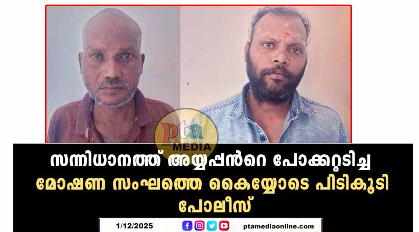സന്നിധാനം – ദര്ശനത്തിന് എത്തിയ അയ്യപ്പഭക്തന്റെ പണമടങ്ങിയ പേഴ്സ് മോഷ്ടിച്ച പ്രതികള് പോലീസിന്റെ പിടിയിലായി. തമിഴ്നാട് അണ്ണാ നഗര് സ്വദേശിയായ അരശു ഗോവിന്ദന് (49), സേലം ഉനത്തൂര് സ്വദേശിയായ പ്രകാശ് ( 39 ) എന്നിവരാണ് അറസ്റ്റിലായത്. അയ്യപ്പ ദര്ശനം കഴിഞ്ഞ് നടപ്പന്തലിന് സമീപത്തുള്ള മരച്ചുവട്ടില് വിശ്രമിക്കുകയായിരുന്ന മലപ്പുറം സ്വദേശി രജീഷിന്റെ പണം അടങ്ങിയ പേഴ്സ് ആണ് മോഷണം പോയത്.