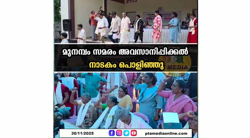 കൊച്ചി: CPIM ഉം കോൺഗ്രസും മുസ്ലിം ലീഗും ചില വൈദികരും ചേർന്ന് ഇലക്ഷൻ ലക്ഷ്യം വെച്ച് നടത്തിയ മുനമ്പം ഭൂസമരം അവസാനിപ്പിക്കാൻ ശ്രമിച്ച നാടകം പൊളിഞ്ഞു. സമരസമിതിയിലെ കരിങ്കാലികളെ ഒഴിവാക്കി രാജീവിന്റെ നാരങ്ങാനീര് കൊടുക്കൽ നാടകത്തെ പുച്ഛിച്ചുതള്ളി സമരവേദിയിൽ നിന്നും ഒന്നിച്ചു ഇറങ്ങിയ മുനമ്പം ജനത പുതിയ സമരസമിതി രൂപീകരിച്ച് പള്ളിക്ക് പുറത്ത് സമരപ്പന്തൽ കെട്ടി സമരം വീണ്ടും ആരംഭിച്ചു. SNDP യും കരിങ്കാലികളെ ഒഴിവാക്കി പുറത്തേക്ക് ഇറങ്ങി ബദൽ സമര സമിതിക്കൊപ്പം കൂടി.