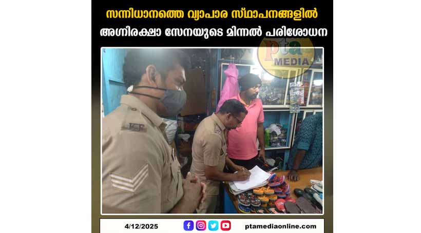 സന്നിധാനം – ശബരിമല തീർത്ഥാടന കാലയളവിൽ ഭക്തരുടെ സുരക്ഷ ഉറപ്പാക്കുന്നതിന്റെ ഭാഗമായി സന്നിധാനത്തെ വ്യാപാര സ്ഥാപനങ്ങളിൽ അഗ്നിരക്ഷാ സേന മിന്നൽ പരിശോധന നടത്തി. സന്നിധാനം സ്പെഷ്യൽ ഓഫീസർ ബിജുമോന്റെ നേതൃത്വത്തിലുള്ള സംഘമാണ് പരിശോധന നടത്തിയത്. പരിശോധനയിൽ ചില വ്യാപാര സ്ഥാപനങ്ങളിൽ കാലാവധി കഴിഞ്ഞ അഗ്നിശമന ഉപകരണങ്ങൾ കണ്ടെത്തി. കൂടാതെ, അടിയന്തര സാഹചര്യങ്ങളിൽ ഉപയോഗിക്കേണ്ട ഫയർ എക്സിറ്റുകൾക്ക് തടസ്സമാകുന്ന രീതിയിൽ സാധനങ്ങൾ സൂക്ഷിച്ചിരിക്കുന്നതായും ശ്രദ്ധയിൽപ്പെട്ടു.