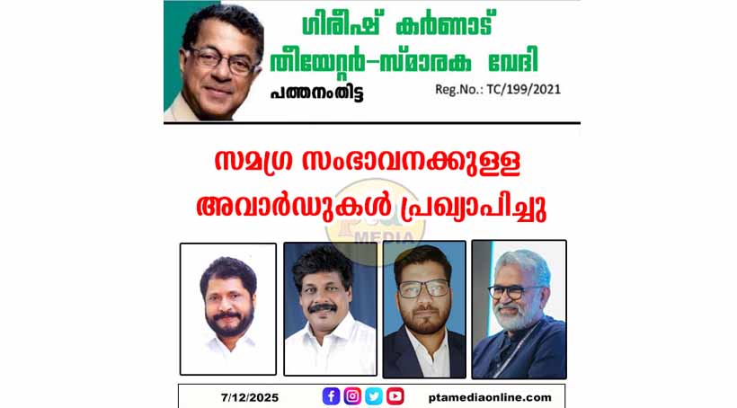 പത്തനംതിട്ട: ഇന്ത്യൻ തീയേറ്റർ രംഗത്തേ വിശ്വ നാടക -ചലചിത്ര സാംസ്ക്കാരിക പ്രവർത്തകനായിരുന്ന ഗിരീഷ് കർണാടിന്റെ നാമധേയത്തിൽ പ്രവർത്തിക്കുന്ന തീയേറ്റർ & സ്മാരകവേദിയുടെ അഞ്ചാമത് സമഗ്ര സംഭാവനയ്ക്കുള്ള അവാഡുകൾ പ്രഖ്യാപിച്ചു. ബ്ലെസ്സി (ചലചിത്രസംവിധാനം, ചിത്രം ആടുജീവിതം) രാജു എബ്രഹാം (രാഷ്ട്രീയം സാംസ്ക്കാരികം) സബീർ പേഴുംമൂട് (പ്രവാസ കലാ -സാംസ്ക്കാരികം ) പി എൻ സുരേഷ് ബാബു നാടകം ( തീയേറ്റർ) എന്നിവർക്കാണ് അവാർഡ്. പതിനായിരം രൂപയും പ്രശംസാപത്രവും ശിൽപ്പവും അടങ്ങിയ അവാർഡ് ഫെബ്രുവരി അവസാനവാരം പത്തനംതിട്ട പ്രസ് ക്ലബിൽ വിതരണം ചെയ്യുമെന്ന് പ്രസിഡന്റ് ഡോ: രാജാ വാര്യർ .രക്ഷാധികാരി രാജേന്ദ്രൻ തായാട്ട് .സെക്രട്ടറി കൊടുമൺ ഗോപാലകൃഷ്ണൻ എന്നിവർ അറിയിച്ചു