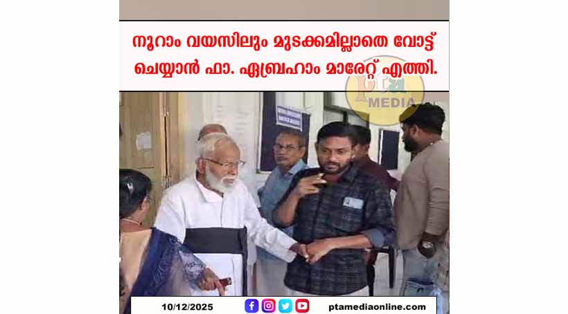 തിരുവല്ല – നൂറാം വയസിലും സമ്മതിദാനാവകാശം വിനിയോഗിച്ച് വൈദികൻ. 1957 ലെ ആദ്യ നിയമസഭാ തെരഞ്ഞെടുപ്പ് മുതൽ വോട്ട് ചെയ്യുകയാണ് കത്തോലിക്ക സഭയിലെ സീനിയർ വൈദികൻ. നൂറാം വയസിന്റെ അവശതകളിലും അത് ഒരു തടസവുമില്ലാതെ തുടരുന്നു. കുറ്റൂർ പഞ്ചായത്ത് 12-ാം വാർഡിൽ കുറ്റൂർ ഗവൺമെന്റ് ഹയർസെക്കൻഡറി സ്‌കൂളിലെ എട്ടാം നമ്പർ ബൂത്തിലാണ് മലങ്കര കത്തോലിക്ക സഭയിലെ സീനിയർ വൈദികൻ ഫാ. എബ്രഹാം മാരേട്ട് വോട്ട് ചെയ്തത്. 1956 ൽ സംസ്ഥാനം രൂപീകൃതമായ ശേഷമുള്ള 57 ലെ ആദ്യ തെരഞ്ഞെടുപ്പ് മുതൽ എല്ലാ തെരഞ്ഞെടുപ്പുകളിലും ഇദ്ദേഹം വോട്ട് രേഖപ്പെടുത്തിയിരുന്നു. കുറ്റൂർ സ്‌നേഹ സദനിൽ വിശ്രമജീവിതം നയിക്കുകയാണ് ഫാ. എബ്രഹാം മാരേറ്റ്. സീനിയർ വൈദികരായ മാത്യു പഞ്ഞിക്കാട്ടിൽ, തോമസ് പുതിയവീട്ടിൽ എന്നിവരും എബ്രഹാം വോട്ട് ചെയ്യാൻ എത്തിയിരുന്നു. വോട്ട് പാഴാക്കരുത് എന്ന സന്ദേശമാണ് തന്നെ വോട്ട് ചെയ്യാൻ പ്രേരിപ്പിക്കുന്നതെന്ന് വൈദികൻ പറഞ്ഞു.