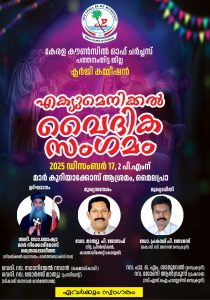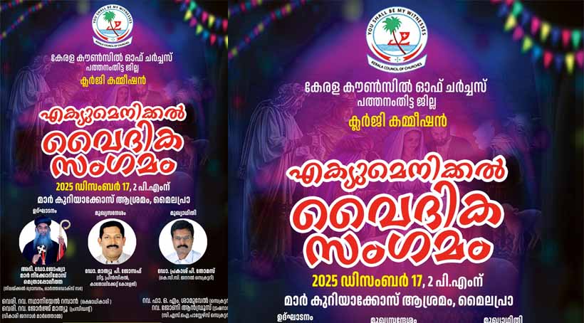 പത്തനംതിട്ട:- കേരള കൗൺസിൽ ഓഫ് ചർച്ചസ് പത്തനംതിട്ട ജില്ലയിലെ പ്രവർത്തനങ്ങളുടെ ഭാഗമായി കെസിസി ജില്ലാ ക്ലർജി കമ്മിഷന്റെ നേതൃത്വത്തിൽ എക്യുമെനിക്കൽ വൈദിക സംഗമം 2025 ഡിസംബർ 17 ഉച്ചയ്ക്ക് 2 മണി മുതൽ മൈലപ്ര മാർ കുര്യാക്കോസ് ആശ്രമത്തിൽ വച്ച് നടത്തപ്പെടുന്നു. കെസിസി ജില്ല ക്ലർജി കമ്മീഷൻ പ്രസിഡന്റ് റവ. ജോർജ് മാത്യു അധ്യക്ഷത വഹിക്കുന്ന യോഗത്തിൽ മലങ്കര ഓർത്തഡോക്സ് സഭയുടെ നിലയ്ക്കൽ ഭദ്രാസനം മെത്രാപ്പോലീത്ത ഡോ. ജോഷ്വാ മാർ നിക്കോദിമോസ് ഉദ്ഘാടനം ചെയ്യുന്നു. കാതോലിക്കേറ്റ് കോളേജ് മുൻ പ്രിൻസിപ്പൽ ഡോക്ടർ മാത്യു പി ജോസഫ് മുഖ്യ സന്ദേശം നൽകുന്നതുമാണ്. കെസിസി ജനറൽ സെക്രട്ടറി ഡോ. പ്രകാശ് പി തോമസ്, കെസിസി ജില്ലാ പ്രസിഡന്റ് വെരി. Rev. ജോൺസൺ കല്ലിട്ടതിൽ കോർ എപ്പിസ്കോപ്പ, കെസിസി ക്ലർജി കമ്മീഷൻ സെക്രട്ടറി റവ എ ആർ നോബിൾ എന്നിവർ ആശംസകൾ അർപ്പിക്കുന്നതും ആണ്.