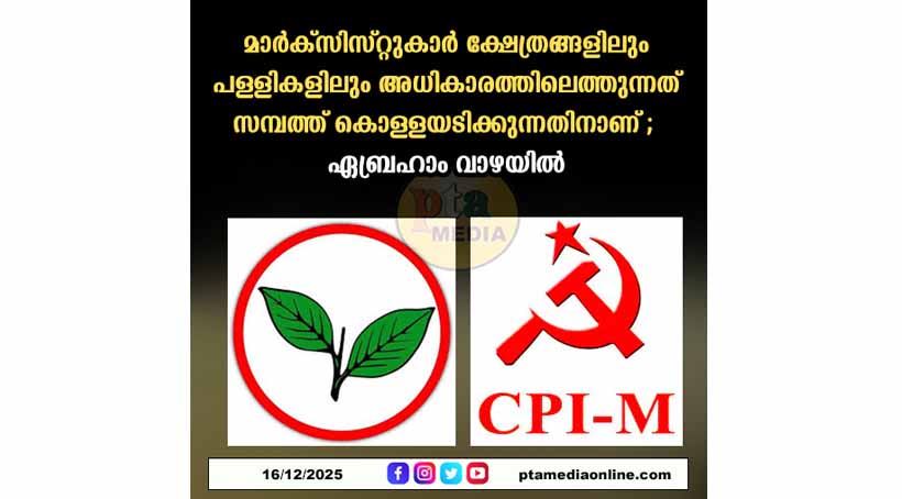 പത്തനംതിട്ട: കേരളാ കോൺഗ്രസ് സംസ്കാരം സി പി എം ന് അടിയറ വെച്ചതാണ് കേരളാ കോൺഗ്രസ് (എം) ന്റെ പരാജയമെന്ന് സംഘടനാ കാര്യ ജില്ലാ ജനറൽ സെക്രട്ടറിയായിരുന്ന ഏബ്രഹാം വാഴയിൽ പറഞ്ഞു. ഇടതുപക്ഷ സംസ്ക്കാരത്തോട് ചേർന്ന് പോകുവാൻ കേരളാ കോൺഗ്രസുകാർക്ക് കഴിയുകയില്ല. സാമ്പത്തീക നേട്ടവും സ്വജനപക്ഷപാതവുമാണ് സി പി എം നെ നയിക്കുന്നത്. ഭൗതീക വാദത്തിൽ അധിഷ്ഠിതമായ നിരീശ്വരവാദികളായ മാർക്സിയൻ സൈദ്ധാന്തികർ ക്ഷേത്രങ്ങളിലും പള്ളികളിലും അധികാരത്തിലെത്തുന്നത് സമ്പത്ത് കൊള്ളയടിക്കുന്നതിനാണ്. ഇത് ജനങ്ങൾ തിരിച്ചറിഞ്ഞതാണ് ഇടതുപക്ഷത്തിന്റെ വൻ പരാജയത്തിന് കാരണം. കേരളാ കോൺഗ്രസ് (എം) ഇടത് മുന്നണി ബന്ധം ഉപേക്ഷിക്കാൻ ഇനിയെങ്കിലും തയ്യാറാകണമെന്നും അല്ലായെങ്കിൽ ആ പാർട്ടിയിലെ ജനാധിപത്യ വിശ്വാസികളോട് നേതൃത്വം കാട്ടുന്ന കൊടും ചതിയായി ആ ബന്ധം മാറുമെന്നും ഏബ്രഹാം വാഴയിൽ പറഞ്ഞു.