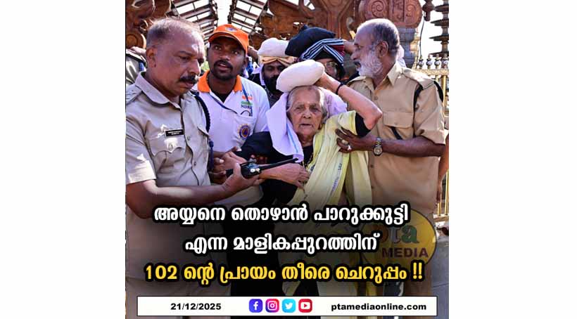 സന്നിധാനം – പ്രായം മറന്ന് ഭക്തിയുടെയും വിശ്വാസത്തിന്റെയും കരുത്തിൽ പാറുക്കുട്ടി മുത്തശ്ശി പതിനെട്ടാംപടി കയറി അയ്യപ്പ സന്നിധിയിലെത്തി ദർശന പുണ്യം നേടി. 102 -ാം വയസിൽ ഇത് മൂന്നാം തവണയാണ് പാറുക്കുട്ടി മുത്തശ്ശി ശബരീ സന്നിധിയിലെത്തുന്നത്. 2023 ൽ 100 ാം വയസിലാണ് കന്നി മാളികപ്പുറമായി സന്നിധാനത്ത് എത്തിയത്. തുടർന്ന് കഴിഞ്ഞ വർഷവും ഇപ്പോൾ ഈ വർഷവും അയ്യപ്പനെ തൊഴുതു. പതിനെട്ടാംപടി വരെ ഡോളിയിലാണ് എത്തിയത്. പിന്നീട് പോലീസ് ഉദ്യോഗസ്ഥരുടെ സഹായത്തോടെ പടി കയറി മുകളിലെത്തി. സുഖമായി അയ്യപ്പനെ തൊഴാൻ കഴിഞ്ഞുവെന്നും പോലീസിന്റെയും മറ്റ് ഉദ്യോഗസ്ഥരുടെയും സഹായം സുഖദർശനം സാധ്യമാക്കിയെന്ന് മുത്തശ്ശി പറഞ്ഞു.