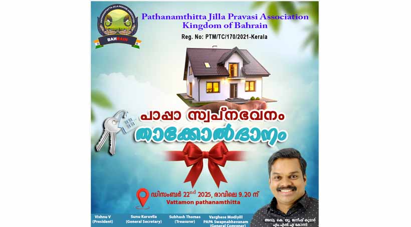 ബഹ്റൈനിലെ പ്രവാസികൾക്കിടയിൽ സജീവമായ ജീവകാരുണ്യ പ്രവർത്തനങ്ങൾ നടത്തുന്ന പത്തനംതിട്ട ജില്ലാ പ്രവാസി അസോസിയേഷൻ്റെ ഏറ്റവും ശ്രദ്ധേയമായ പദ്ധതികളിലൊന്നാണ് ‘പാപ്പാ സ്വപ്നഭവനം’. സ്വന്തമായി ഒരു വീടെന്ന സഹപ്രവർത്തകയുടെ സ്വപ്നം യാഥാർത്ഥ്യമാക്കാൻ കഴിഞ്ഞതിൻ്റെ സന്തോഷത്തിലാണ് അസോസിയേഷൻ പ്രവർത്തകർ.