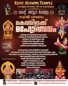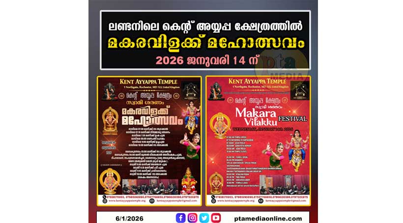 റോച്ചസ്റ്റർ, കെന്റ്: ഇംഗ്ലണ്ടിലെ കെന്റ് അയ്യപ്പ ക്ഷേത്രത്തിൽ 2026 ജനുവരി 14-ാം തീയതി (ബുധനാഴ്ച) മകരവിളക്ക് മഹോത്സവം ഭക്ത്യാദരപൂർവം ആഘോഷിക്കുന്നു. അയ്യപ്പ ഭക്തർക്കായി സമ്പൂർണമായ പൂജാ-ആചാരങ്ങളും സാംസ്കാരിക പരിപാടികളും സംഘടിപ്പിച്ചിരിക്കുന്നു.