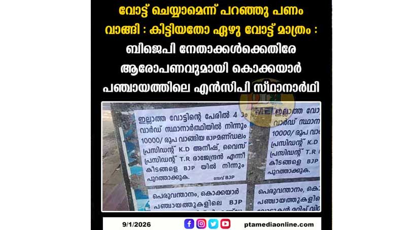 ബിജെപി ഏലപ്പാറ മണ്ഡലം പ്രസിഡന്റ് കെ.ഡി അനീഷ്, വൈസ് പ്രസിഡന്റ് ടി.ആര് രാജേന്ദ്രന് എന്നിവര്ക്കെതിരെയാണ് പരാതി. ബിജെപിക്ക് 120 വോട്ടുകളുള്ള വാര്ഡില് പിന്തുണ നല്കാമെന്ന് പറഞ്ഞ് ഇവര് 25,000 രൂപ ആവശ്യപ്പെട്ടതായും ഒടുവില് 10,000 രൂപ വാങ്ങി വഞ്ചിച്ചതായും സ്ഥാനാര്ത്ഥി ആരോപിക്കുന്നു. എന്സിപി ജില്ലാ ഭാരവാഹി ജയചന്ദ്രനോടൊപ്പം നേരിട്ടെത്തിയാണ് പണം കൈമാറിയത്.