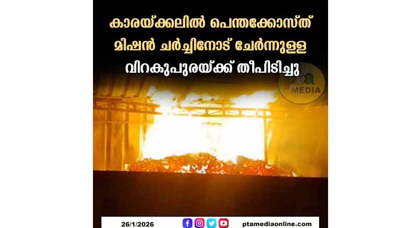 തിരുവല്ല : കാരയ്ക്കലിൽ പെന്തക്കോസ്ത് മിഷൻ ചർച്ചിനോട് ചേർന്നുള്ള വിറകുപുരയ്ക്ക് തീപിടിച്ചു. അഗ്നിശമനസേനയെ എത്തി തിയണച്ചു. ശനിയാഴ്ച രാത്രി 9 മണിയോടെയായിരുന്നു സംഭവം. കാരയ്ക്കൽ ദ പെന്തക്കോസ്ത് മിഷൻ ചർച്ചിൽ ആയിരുന്നു സംഭവം. തീ ആളിപ്പടരുന്നത് കണ്ട സമീപവാസികളാണ് അഗ്നിശമനസേനെ വിവരമറിയിച്ചത്. തുടർന്ന് അഗ്നിശമനസേനേ എത്തി തീ അണയ്ക്കുകയായിരുന്നു. ഷോർട്ട് സർക്യൂട്ടാണ് തീപിടുത്തത്തിന് ഇടയാക്കിയതെന്ന് ആണ് പ്രാഥമിക നിഗമനം.